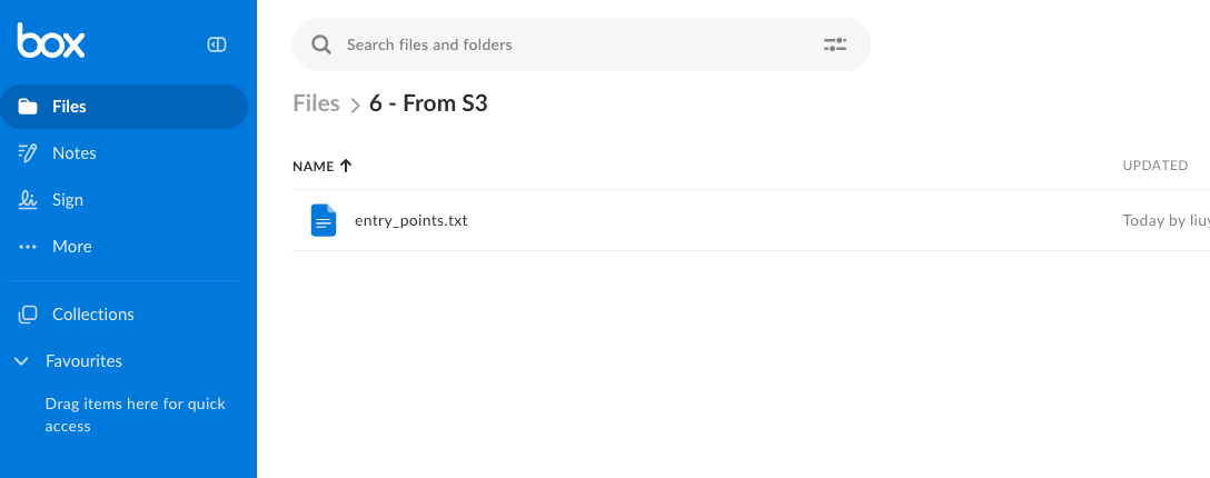 In my case, I needed to upload files into Box, but Box.com was blocked on the network I was on. Direct uploads through the Box web UI weren’t an option. On the other hand, the AWS Management Console and S3 were fully accessible.
